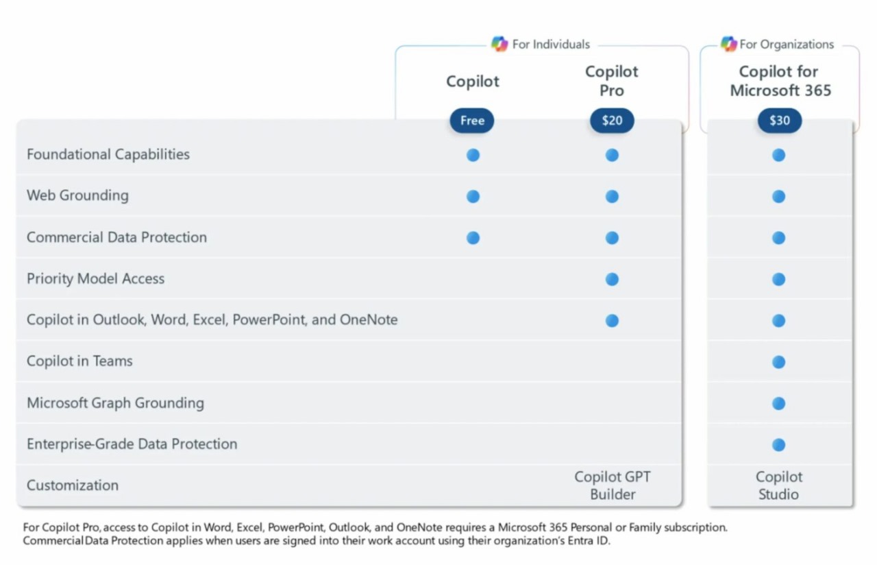 Em janeiro de 2024, a Microsoft atualizou sua estratégia de Copilot com base no feedback dos clientes. A empresa descobriu que havia diferentes "tipos" de usuários. Um segmento inclui criadores, pesquisadores e programadores que desejam acesso rápido às mais recentes ferramentas de IA generativa. Outro segmento inclui clientes do Microsoft 365 que desejam aproveitar para uso pessoal. Além disso, existem usuários que precisam de acesso às capacidades completas, juntamente com a proteção de dados corporativos, base do Microsoft Graph e Teams. Como resultado, agora existem diferentes "planos do Copilot" disponíveis para cada tipo de usuário, começando com a introdução do Microsoft Copilot Pro.